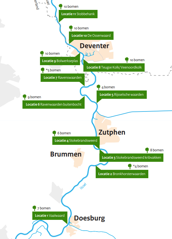 Op 11 plekken langs de IJssel, van vlakbij Doesburg tot voorbij Deventer, worden in het totaal 74 dode bomen, deels onder water afgezonken. Dat gebeurt tussen kribvakken, in uiterwaarden, geulen en plassen. De bomen worden stevig verankerd met een ketting om te voorkomen dat ze op drift raken. De vaarweg blijft vrij voor de scheepvaart. Veiligheid staat voor Rijkswaterstaat (RWS) voorop.