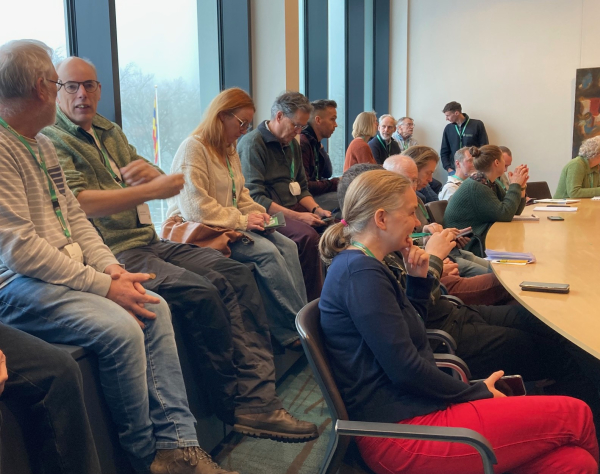 Gelukkig waren we op tijd. Laatkomers moesten het doen met een plekje in de vensterbanken. De grote belangstelling is niet zo vreemd. De Omgevingswet gaat op 1 januari in en is nieuw voor iedereen. Martijn benadrukte hoe groot de verandering is. In de nieuwe wet staat hoe we de fysieke omgeving waarin we wonen en werken gaan beheren en ontwikkelen. Welke regels en processen daarbij moeten worden gevolgd, op alle thema’s zoals water, natuur, verkeer en woningbouw. Voorheen waren daar 26 aparte wetten voor nodig en dat maakte het vaak knap ingewikkeld om iets te regelen of om ergens op te reageren. De nieuwe Omgevingswet zorgt voor minders regels, meer onderlinge samenhang en meer ruimte voor eigen initiatief van mensen en groepen. Vooral dat laatste biedt groene organisaties kansen om zelf actief mee te doen.