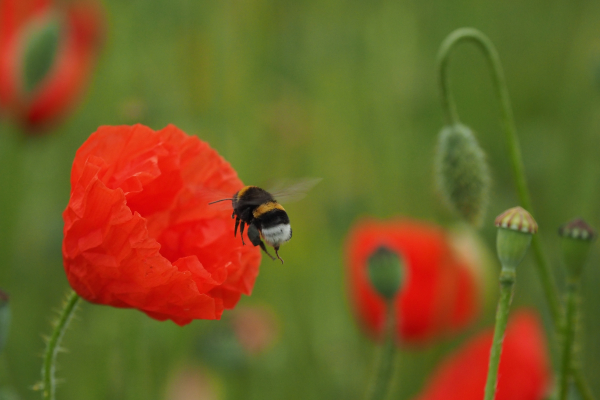 Als je over de akker loopt valt een duidelijk onderscheid waar te nemen. In de rand waar de bloemen werden gezaaid staan veel meer verschillende soorten bloemen. Ik zag er zelfs de bolderik. Op de akker overheersen de echte kamille en de klaproos. Bij de klaproos komt dit doordat de wind de zaadjes verspreid. Dat gaat heel ingenieus. Boven op de zaaddoos zit een hoed. Als het zaad rijp is gaat de hoed omhoog en kan de wind grip krijgen op het zaad. Via kleine openingen wordt het zaad in kleine aantallen verspreid. Afhankelijk van de wind komt het dan ergens terecht in een zo groot mogelijk spreidingsgebied.