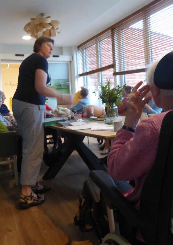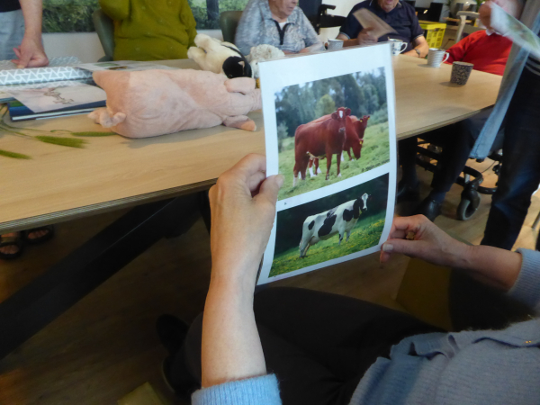 In het woon-zorgcomplex aangekomen gaan we naar een zaaltje waar zich negen bewoners verzamelen, merendeels vrouwen. Als iedereen om de grote tafel zit, komt er wat te drinken en pakken Toos en Ans hun spullen uit. Ze vragen wie van de aanwezigen is opgegroeid op of bij een boerderij. Er zijn er een paar, onder wie een kwieke dame. ‘O, dus u kunt het wel zeggen als we iets fout vertellen?’, vraagt Toos. ‘Ja, dan griepen wie wel in!’ antwoordt de mevrouw gevat.