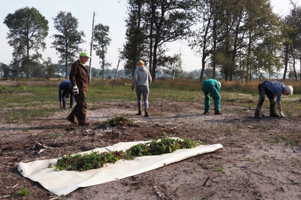 De rest van de groep wandelt nog een stukje verder en gaat aan de slag op een net geplagd veld om daar de nu nog zeer kleine maar nadrukkelijk aanwezige opslag te verwijderen. Opslag zijn planten en zelfs jonge dennetjes die het ontwikkelen van natte heide in de weg staan. Dit werk moete met regelmaat gedaan worden en is een tijdrovend handmatig werk.