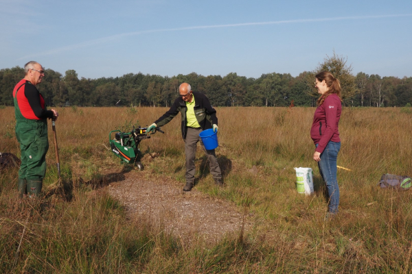 In het veld splitst de groep zich. Een klein deel gaat bezig met zaaien van de klokjesgentiaan. Op enkele plekken worden daartoe rechthoekige delen vrijgemaakt, er wordt kalk gestrooid en daarna mogen de zaden erin.