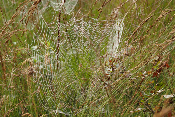 Als de groep het veld inloopt zien ze de herfst al uitgebeeld worden door een veld vol spinnenwebben. Een prachtig gezicht met alle dauwdruppels erop.