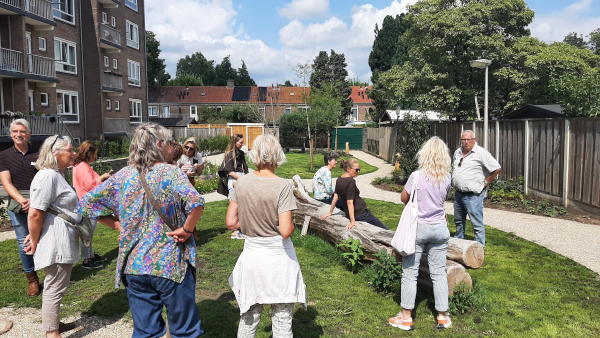 Op de zonovergoten middag fietsten ongeveer 35 mensen met elkaar langs allerlei groene initiatieven van enthousiaste bewoners. De tocht voerde langs groene geveltuintjes, buurtmoestuinen, bloemenlinten en geadopteerde boomperken. Niet alleen initiatieven van bewoners, maar ook groene initiatieven van gemeente en woningcorporatie kwamen aan bod. We zagen hoe met de aanleg van wadi’s meteen ook de biodiversiteit verhoogd wordt en hoe de woningbouwcorporatie bij de renovatie van de woningen ook de buitenruimte een natuurlijke impuls geeft.