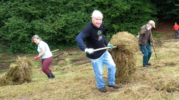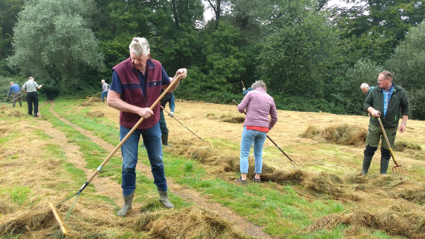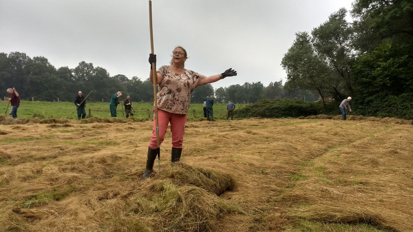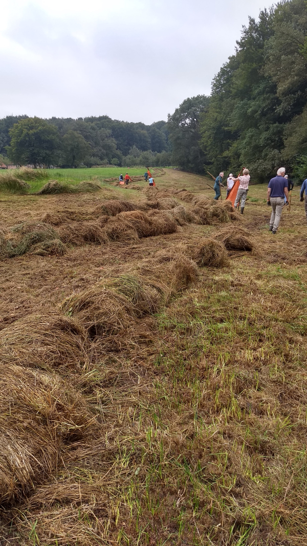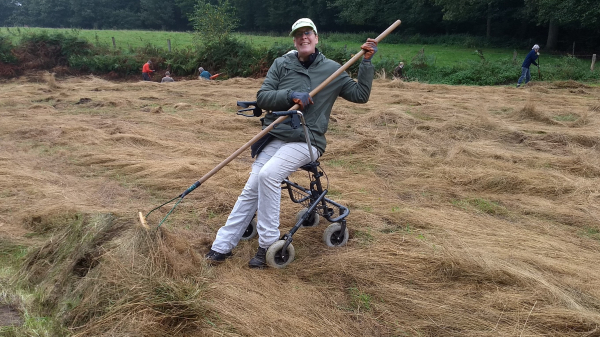 Een flinke groep van zo’n 25 vrijwilligers stak de handen uit de mouwen en ging voortvarend te werk. Niet te hooi en te gras, maar met een door Rob uitstekend ingeschatte systematiek van rijen rillen leggen, werd de kleine hel tot een grote hemel omgevormd.