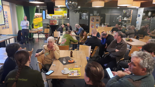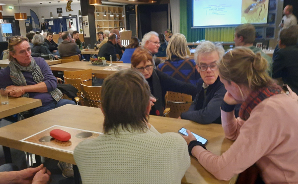 Op de aftrapavond waren tientallen Sallanders afgekomen die links om of rechtsom ook mee willen doen de roetbij te adopteren en dus de biodiversiteit van Salland naar een hoger plan te helpen. Hóe ze dat willen doen, haalde de Duurzaamheidscoaltie uit de zaal op aan de hand van een aantal vragen waar in kleine groepjes over gediscussieerd werd.