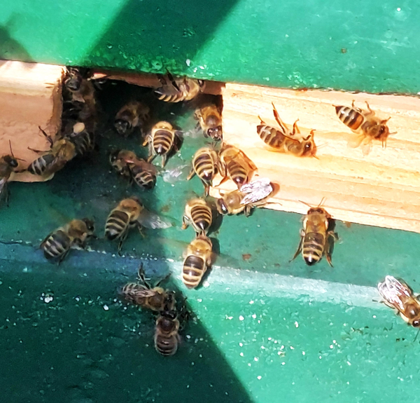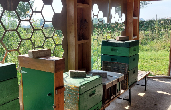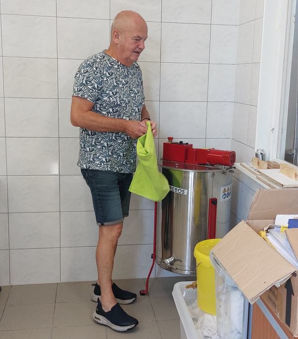 Sinds 2020 biedt Erve Peeze onderdak aan ’t Iemenschoer, de imkersvereniging voor Almelo en omstreken. Jan Meijerink en Ellen Rodenstein beheren de bijenstal en de slingerruimte. Daar kunnen niet alleen leden van de vereniging hun honing komen slingeren, maar ook cursisten. Jan: “In de bijenstal geven we cursussen aan beginnende imkers. Zo’n cursus bestaat uit theorie- en praktijkbijeenkomsten die parallel lopen aan een heel bijenseizoen. De cursisten sluiten de cursus af met een examen. Wanneer ze geslaagd zijn, krijgen ze een kleine kast met een bijenvolkje mee.”