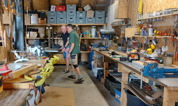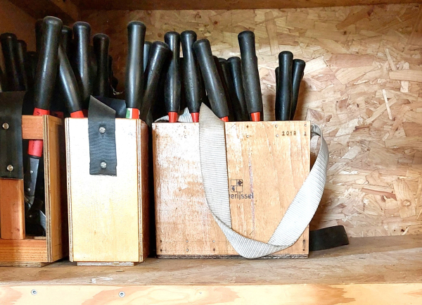 “We lenen aan dertig tot veertig groepen gereedschap voor natuurwerk uit,” vertelt Bert. “Als Landschap Overijssel de aanvraag heeft goedgekeurd, kijken we of er voldoende voorraad is, zetten het klaar en noteren wie welk gereedschap meeneemt. Dat kan in een krat, maar een groep kan ook een aanhanger lenen, compleet met EHBO-doos en veiligheidsmateriaal. We hebben van alles, ook ladders voor bijvoorbeeld de snoei van hoogstamfruitbomen en het knotten van wilgen. Als het gereedschap terugkomt checken we of alles is ingeleverd, controleren het, repareren het zonodig – daar zijn onze vrijwilligers Paul Oele en Harry Becker goed in – en smeren het.”