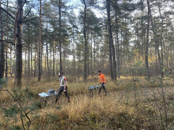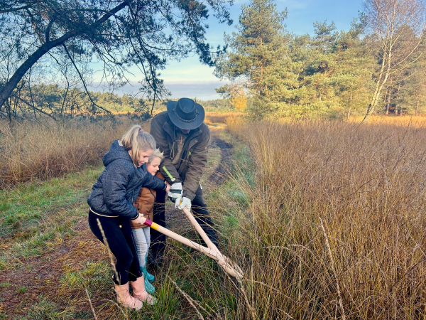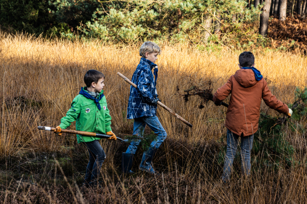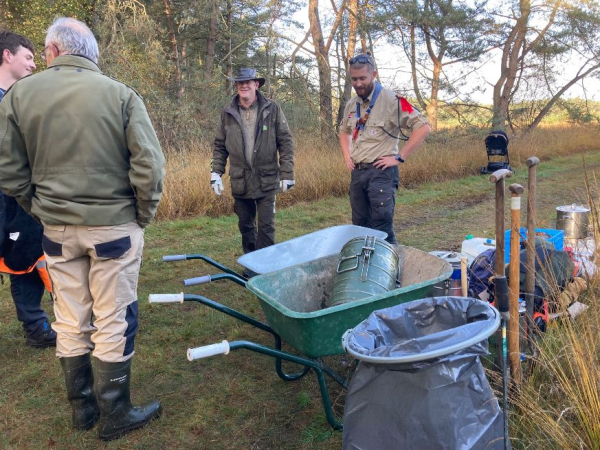 Wim en Leo vertellen in het kort waar en hoe wordt gewerkt en dan kan iedereen, ook de gedeputeerde, aan de slag. De welpen, de jongsten van de groep, trekken de boompjes met behulp van houten scharen uit de heide. Lukt dat niet, dan komt een ouder met een schep helpen. Als snel worden wangen rood, broeken modderig en laarzen nat. Verderop zagen de oudere scouts grotere dennen en ook een enkele berk om. “Dat is nog niet gemakkelijk”, zeggen twee jongens hijgend. Want hoe krijg je zo’n grote trekzaag regelmatig heen en weer? Gelukkig zijn er de vrijwilligers van Landschap Overijssel om te helpen.