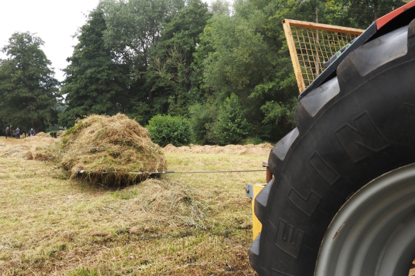 Een paar dagen later wordt het maaisel bij elkaar geharkt door leerlingen van het praktijkonderwijs uit Oldenzaal. Op zaterdagochtend wordt, door de vrijwilligers uit Ootmarsum, het maaisel op grote zeilen gelegd die verbonden zijn aan een lier. Als het zeil vol ligt, wordt de lier mechanisch aangetrokken naar de rand van het hooiland. Waar zich een mooie bult vormt dat later door een grote trekker afgevoerd kan worden.