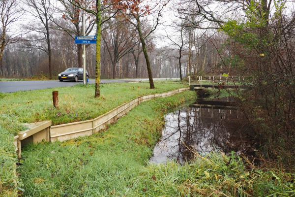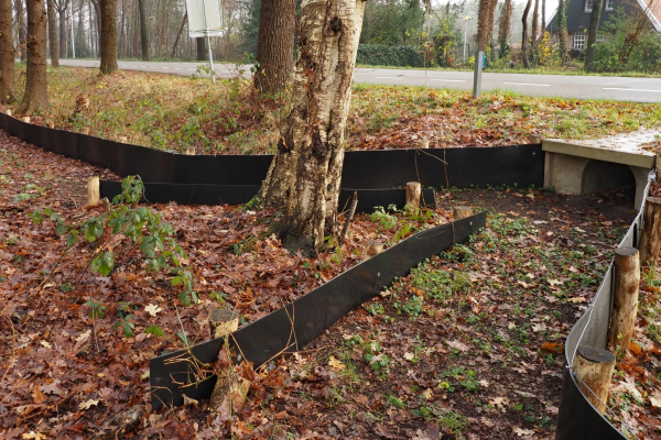 Aangekomen op de parkeerplaats van Staatbosbeheer van de Engbertsdijksvenen aan de Oude Hoevenweg bij Vriezenveen valt de informatie- en zithoek meteen op. Die ziet er fonkelnieuw uit. Een zeer fraai ontwerp zoals bovenstaande hoofdfoto laat zien. Maar als kenner (ik loop zelf mee met de paddentrek in Deventer) zie ik ook meteen de faunapassage langs de kant van de Oude Hoevenweg. Niet zo opvallend maar voor mij ook indrukwekkend omdat die er zeer professioneel uitziet.