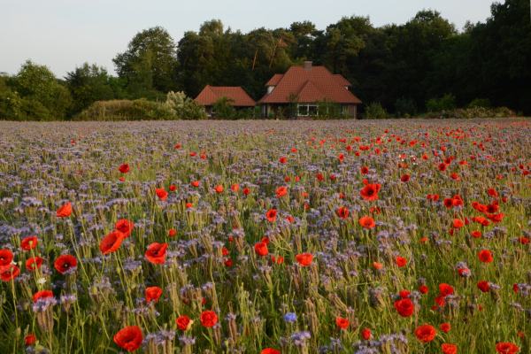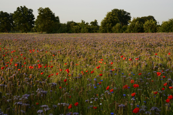 Vorig jaar is de kruidenakker er even niet geweest omdat het perceel te veel vergrast was. Om dit tegen te gaan stond er vorig jaar rogge op. Dit jaar is de 7000 m2 opnieuw handmatig ingezaaid, met een mengsel bestaande uit facelia (ook wel bijenbrood genaamd, dus een echte bijenplant), klaproos, korenbloem, siererwt, borage etc, gemend met 10 kg tarwe, 10 kg gerst en 10 kg rogge. De laatste drie ter versteviging van de planten. Aan de rand staan ook nog zonnebloemen.