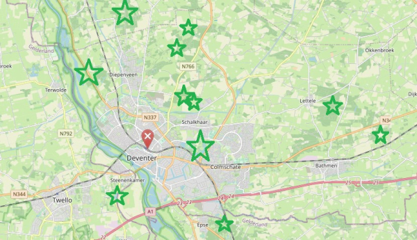 • kaart met markeringen van terreinen waarop de Groene Knoop actief is rondom Deventer
