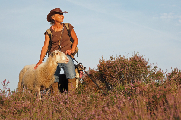 Ze is nu 4 dagen per week actief als vrijwillig herder waarvan 2 dagen voor de kudde op de Lemelerberg. Een vetpot is het zeker niet en de vraag waarom ze dit dan doet beantwoord ze op de top van de Lemelerberg "kijk eens om je heen, dit is toch magistraal, je voelt je hier zo één met de natuur" En inderdaad ik ervaar het mee. Kilometers ver kun je kijken over prachtige bloeiende heide en daarachter het platteland van Nederland. De schapen die rustig grazen maar zo nu en dan ook een knuffel komen halen, het samenwerken met de honden om de kudde de goede kant op te krijgen, maar ook de aandacht en liefde die je van je honden krijgt. Natuurlijk zijn er koude en natte dagen maar ook dan voel je je één met de natuur.