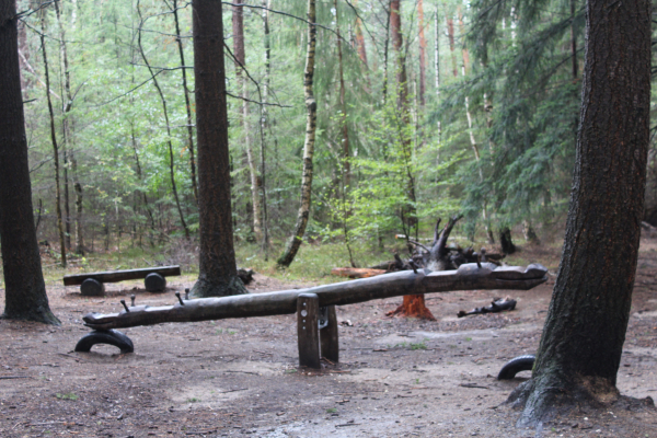 We volgen de houten eekhoorns die nog wel door een collega van Kees Jan zelf worden gemaakt. Bij het houten treintje treffen we een jong gezin aan met twee kinderen. Kijk, toch nog bezoekers. Ze hebben veel plezier in de route. Zo treffen we nog een paar gezinnen, gestoken in regenjas, korte broek en laarzen, laten zij zich dit leuke middagje uit niet ontzeggen door een paar druppels regen. De huisjes, de schommel aan een tak, de wipwappen, de zelfgebouwde takkenhutten , de troon, de palen waar je overheen kunt lopen of kunt slalommen, de paaltjes om bok te springen, het oefent allemaal een aantrekkingskracht uit op kinderen ( én volwassenen) om lekker te spelen. Op een open plek met de naam Twilhaar, staat de omtrek aangegeven van een oud boerderijtje dat hier stond. Weer op de terugweg komen we langs een prachtige kijk hut in een grote boom.