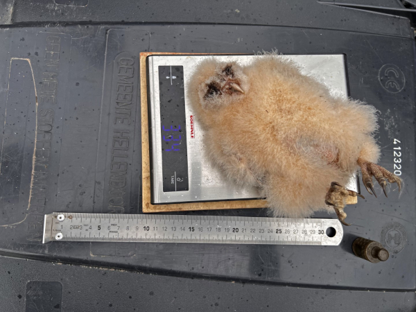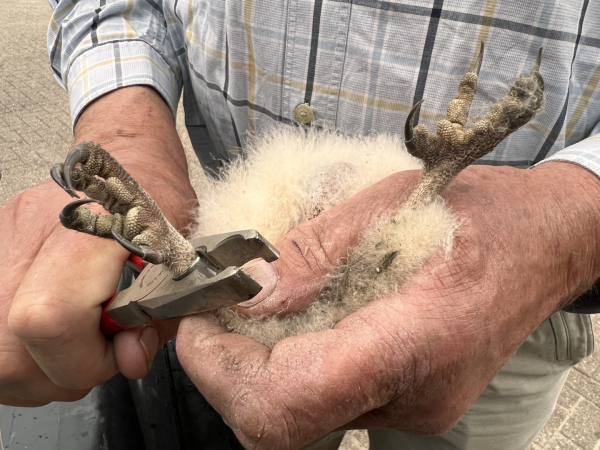 Het werk van de groep met deze kast valt nu goed te volgen. Eerst worden de jongen voorzichtig uit de kast getild en in een emmer gestopt. Beneden worden ze geringd, de vleugels worden gemeten om te bepalen hoe oud ze zijn, daarna worden ze gewogen en geregistreerd. De beide jongen zijn iets meer dan 20 dagen oud. Gemiddeld zijn ze na 60 dagen zo ver dat ze uit kunnen vliegen. Terwijl de registratie plaatsvindt, is vrijwilliger Frits Bosman bezig de kast uit te mesten zodat de jongen en het vrouwtje de ruimte weer hebben. Ongelooflijk wat een mest komt daaruit. Daarna gaan de jongen weer in het nest en kan de vrouwtjes uil weer terugkeren als het weer rustig is.