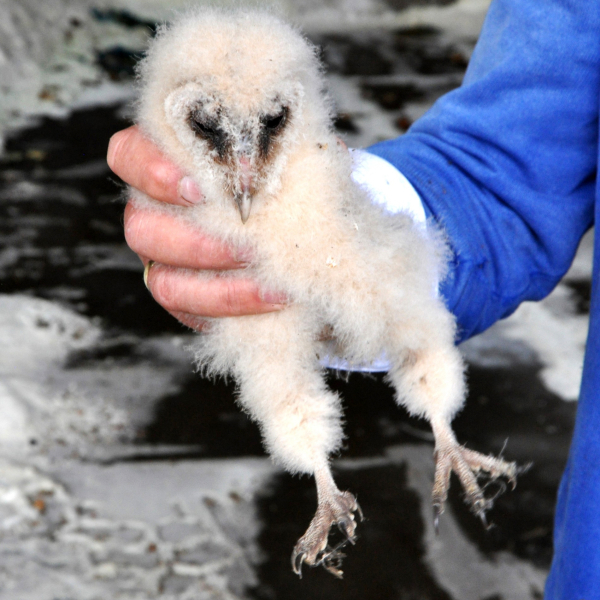 In tegenstelling tot de bosuilenkasten die allemaal in het bos zijn opgehangen, hangen de kerkuilenkasten meer in de bebouwde omgeving bij particulieren. De kast waar onze meeste interesse naar uit gaat hangt op de gemeentewerf van Hellendoorn in een grote open loods waar de wintervoorraad strooizout ligt. Deze kast is de laatste kans van de werkgroep om nog jongen te ringen en warempel, er zitten twee jongen in. De laatste kast van het seizoen brengt dus toch nog een klein succes!