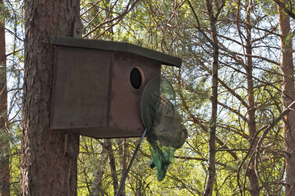 Voor de tweede ronde moeten een viertal kasten gecontroleerd worden. In twee kasten zat bij de eerste ronde wel een uil maar lagen er geen eieren. Het kan zijn dat de eieren nog gelegd moeten worden maar het kan ook een ‘roester’ zijn. Dat is een uil die deze kast als rustplek gebruikt. In de beide andere kasten zaten eieren die wel warm waren. Dit is een teken dat er gebroed wordt. Elk nest wordt bij de tweede ronde omzichtig benaderd om te voorkomen dat de uil die er eventueel inzit wegvliegt. In twee van de vier kasten wordt een uil aangetroffen. Door een net met een ring voor de ingang te houden kan de uil worden afgevangen en beoordeeld worden zonder dat deze verwond wordt.