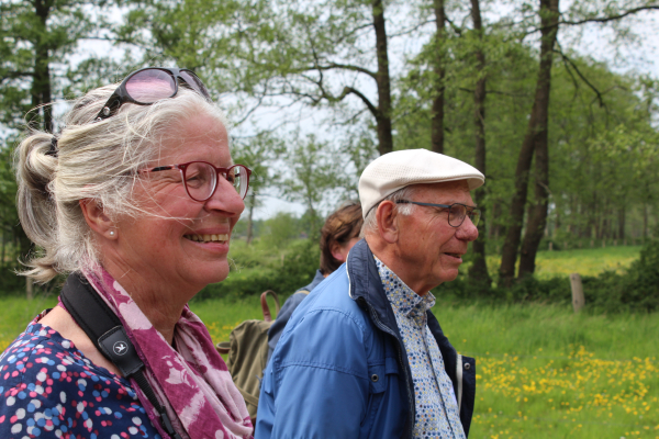 We staan stil en Klaasje die vrijwillig boswachter is, vertelt ons iets over rabatten: opgehoogde parallel lopende dijkjes waar grove dennen op werden aangeplant. Deze waren voor de mijnbouw in Limburg en werden ook wel kraakhout genoemd. Klaasje is na haar IVN Natuurgidsenopleiding bij het destijds nog nieuwe informatiecentrum De Pas begonnen. Het informatie geven, mensen aanspreken en de vrijheid die ze had, spraken haar aan. Nu is ze al weer 6 jaar vrijwillig boswachter op Landgoed Eerde en de Sprengenberg. Ze is blij dat de coronatijd voorbij is, het mensen aanspreken was toen minder leuk. “Ze zijn nu veel meer ontspannen.”