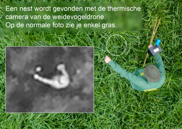 De dames en heren vogels zouden het weidevogelbeheer heel wat makkelijker maken als ze hun nesten ook binnen het plas-dras gebied zouden maken. Helaas is dat dus niet zo. De plas-dras gebieden zijn ideaal en noodzakelijk voor het dagelijks foerageren van de vogels maar de nesten liggen toch vaak verderop in het lange gras verscholen. Om te voorkomen dat ze met het grasmaaien vernietigd worden moeten ze opgespoord worden met behulp van drones, uitgerust met warmtecamera’s en speciale software (‘spotprogramma’) om de nesten te lokaliseren .
