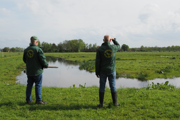 Plas-dras is een stuk weiland dat kunstmatig deels onder water wordt gezet terwijl het drassige deel veel mogelijkheden geeft aan de jonge vogels om zich te verbergen voor predatie (het wegroven en opeten door andere dieren zoals vossen, roofvogels etc). Een plas-dras is voor een boer een onbruikbaar stuk land zo leerde ik van een Drentse boerin, die heel enthousiast onder de twitternaam @boerinhendrika twittert over plasdras en weidevogelbeheer. Om die reden krijgt boeren er een vergoeding voor. Grotendeels dekt die vergoeding wel de vermindering van opbrengsten af, maar het blijft ook voor de boeren de liefde van de natuur die hen drijft. Op de foto hieronder kijken Hennie Schröder (rechts) en Theo Lohuis uit over 1 van de 4 plas-dras gebieden die onder beheer van de Vogelwerkgroep Geesteren vallen. De bamboestokken die Theo in de hand heeft zijn stokken die gebruikt worden om nesten te markeren, zo kan de boer om het nest heen maaien, zodat het gespaard blijft en de eieren kunnen uitkomen.