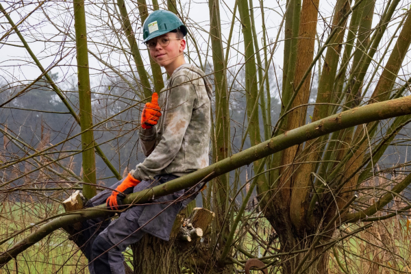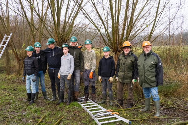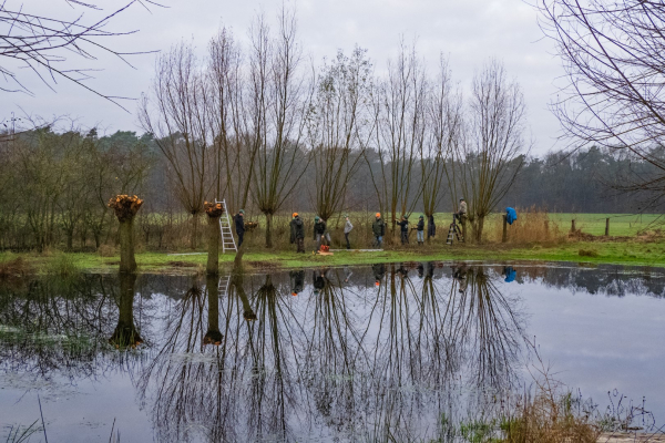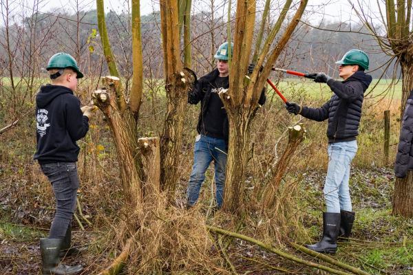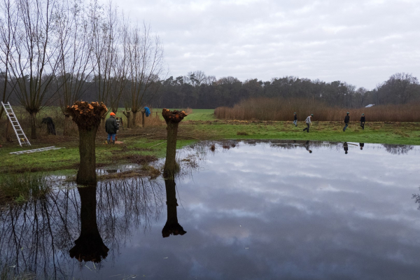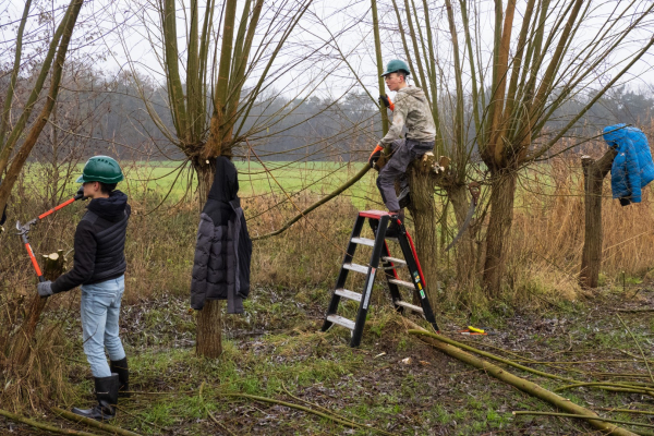 Even later zie ik de groep lopen in een prachtig, niet al te groot, weiland met een ruime waterpartij die door de vele regenval van de afgelopen maanden ook nog eens buiten de oevers getreden is. Drassige grond al met al. De klus waarmee de leerlingen bezig zijn is het knotten van wilgen, een deel van de wilgen staat door de vele regen zelfs met de voeten in het water.