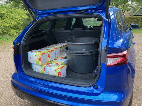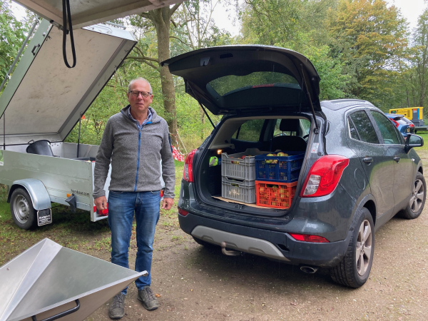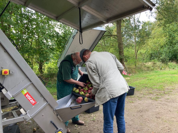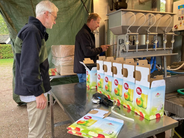 Twee uur lang was het een komen en gaan van auto’s. Met appels en peren in de kofferbak, op de achterbank of in de aanhangwagen. Bescheiden porties van 20 en grote ladingen van 200 kg. De vrijwilligers vouwden bijna twee honderd pakken, voor sommige klanten kleine van 3 liter en voor anderen grote van 5 liter, en plakten er na het vullen een sticker met een houdbaarheidsdatum op. Blije klanten laadden hun kant en klare sap weer in.
