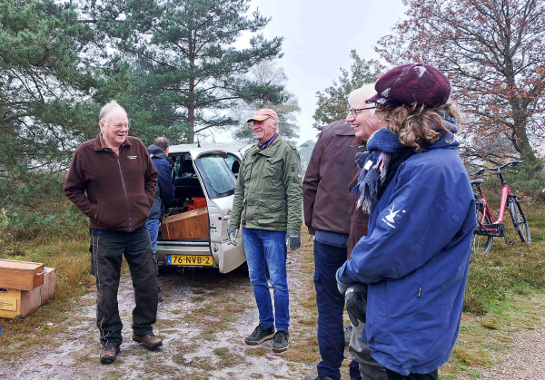 Al snel komen er meer mensen aangefietst. Gerard Huis in ’t Veld, die de groep organiseert, arriveert met de auto waarin hij takkenscharen en andere gereedschap vervoert. Ook Wim uit Rijssen komt met de auto, want hij zorgt, zoals altijd, voor de koffie. Met de twee auto’s en fietsen rijdt de groep de heide op. Gerard stopt bij een deel dat vol staat met kleine dennen- en berkenboompjes. “Hier gaan we vandaag aan het werk. Kijk, daar verderop werken we niet; daar staat het vol gras. Hier gaan we vergrassing tegen en geven zo de heide een kans. Als we niets doen is het over een paar jaar bos. Dan verlies je ook de speciale plant- en diersoorten die de heide nodig hebben.”