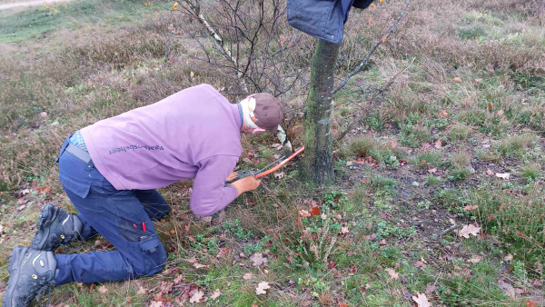 De groep waaiert uit over de hei. Wat houdt ‘vrijzetten’ van hei nu precies in? Heel eenvoudig: met een takkenschaar knip je de takken en dunne stammetjes van berkjes en dennetjes zo dicht mogelijk bij de grond af. Als je alle takken weghaalt, komen de boompjes niet meer op. De takken blijven liggen en vergaan vanzelf. “De dikkere stammen kun je hiermee niet doen”, vertelt een vrijwilliger. “Soms kom ik terug met een vriend en gaan we die met een kettingzaag te lijf. Dat doen we doordeweeks, want dat heeft Staatsbosbeheer liever niet op zaterdag. Zo maken we het gewoon weer netjes.”