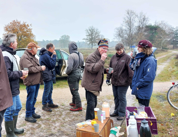 Om half elf zet Wim de koffie en chocolademelk met krentenwegge en koek klaar. “We werken onder de vlag van Staatsbosbeheer, dat ons waar nodig ondersteunt met adviezen. Ook ontvangen we per vrijwilliger een kleine vergoeding voor elke gewerkte ochtend”, legt Gerard uit. “Daarvan betalen we bijvoorbeeld de koffie en het gereedschap.” Na de koffie gaat de groep weer verder met het werk. “Het is gewoon lekker werken”, zegt een vrijwilliger. “Straks ziet het er goed uit en volgend jaar komen we gewoon weer terug!”