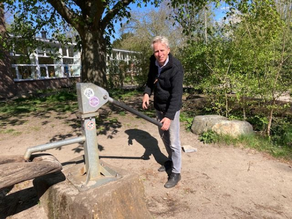 We lopen samen een stukje over het plein. Langs een grote kastanjeboom, spannende bamboebosjes en een boomhut waar ieder kind van droomt. Zijn favoriete plek? “De waterpomp”. Hiddo zwengelt een paar keer en het water klettert in de dunne, uitgeholde boomtak. “Kinderen merkten laatst op dat er geen emmertje onder past. Dat gaan we nog veranderen”. Want geloof het maar, een Groen Schoolplein is nooit helemaal af.